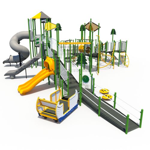 Young Canadians of all abilities will enjoy playing on the All-Canadian accessible playground structure. A wheelchair ramp leads to a spacious hex deck and on to the spring-mounted Tippy Canoe where multiple users can bounce over the waves together. Various climbers and slides round out the fun on this Canada-themed design.